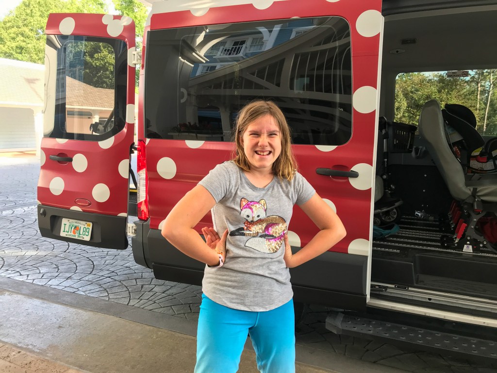 One thing we have loved using at the parks is the handicapped accessible Minnie Vans. Although the free Disney transportation is great most of the time, sometimes it is more convenient to have door-to-door transport. If you’re visiting a resort from another resort for a meal, or you’re just not up for fighting the crowded buses at the end of a long day, the Minnie Vans are life savers. Now the important thing to know is you must call ahead to reserve an accessible van. With a normal Minnie Van you can use the Lyft app, but the number of vans that can accommodate an ECV is limited so be sure to call an hour to 45 minutes before you need to be picked up. The number is (407) 828-3500 and there’s more info here. There is a designated pick up area at each park that should be communicated to you when you make your reservation. You can remain in the ECV or get out and sit in a seat. The fee will be added to your guest folio at your resort but not the gratuity. The drivers are professional and so friendly, so don’t forget to tip!